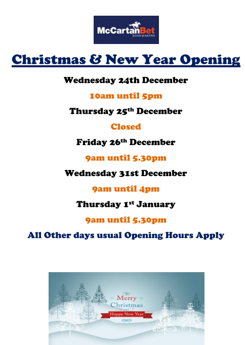 Our Call Centre & Betting Shops Open from 9am to 9pm Monday to Saturday and 10am to 6pm on Sundays. For Betting Odds please see Our Live Odds Page Here